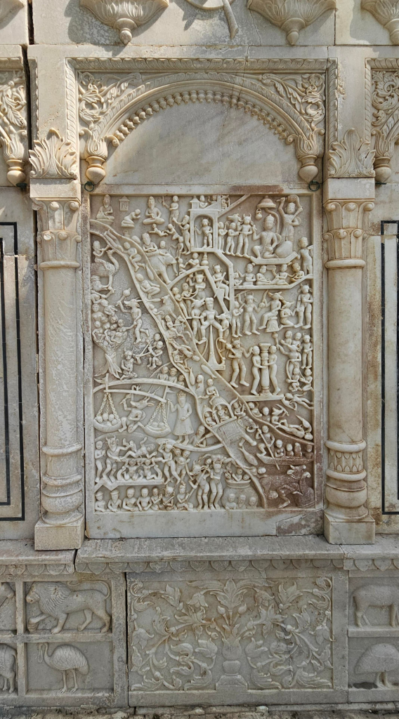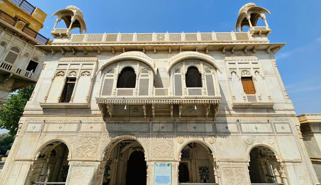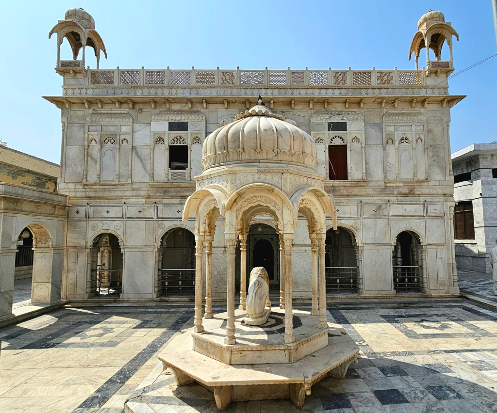 Getting off the boat at the western edge of the island called Raj Ghat, I walk up the steps to a platform to a tall marble-adorned gate. Just to the left of the gate is the all-white marble, square-shaped temple dedicated to Baba Bankhandi. It is beautifully decorated on the outside with chatris, balconies, and murals – all in white marble. The entrance to the temple is on the east side, as is usual with old Hindu temples. In front of the entrance stands a white marble lion facing the entrance.