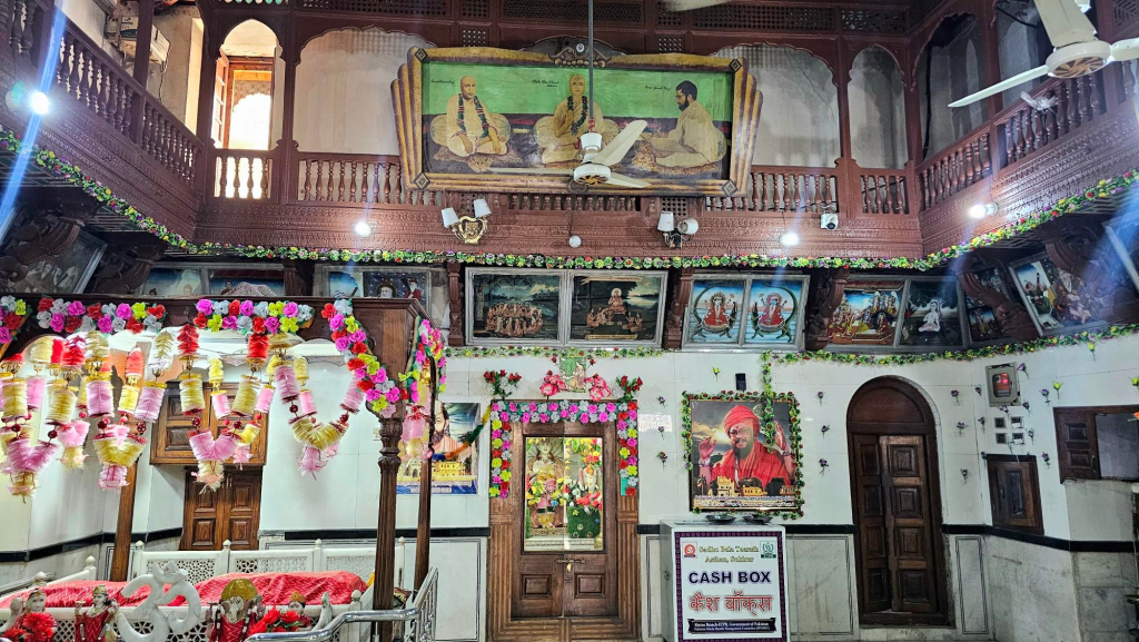 The temple priest provided head coverings for my Muslim friends and led us barefoot into the temple dedicated to Baba Bankhandi. At the far end, in the centre, is a small, recessed room with a large statue of the Baba, with his Kharavan (wooden sandals) placed in front of it. The main room is adorned with paintings of Hindu mythology from the early 20th century and tacky plastic flexes promoting the descendants of the Baba to this day. All around the top is a beautifully carved wooden balcony.