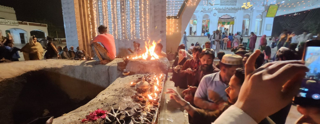 At the centre of the mela is a fire pit, referred to as alao, symbolising the fire of divine love. Men and women offer lamps (chirags) to the fire along with flowers.